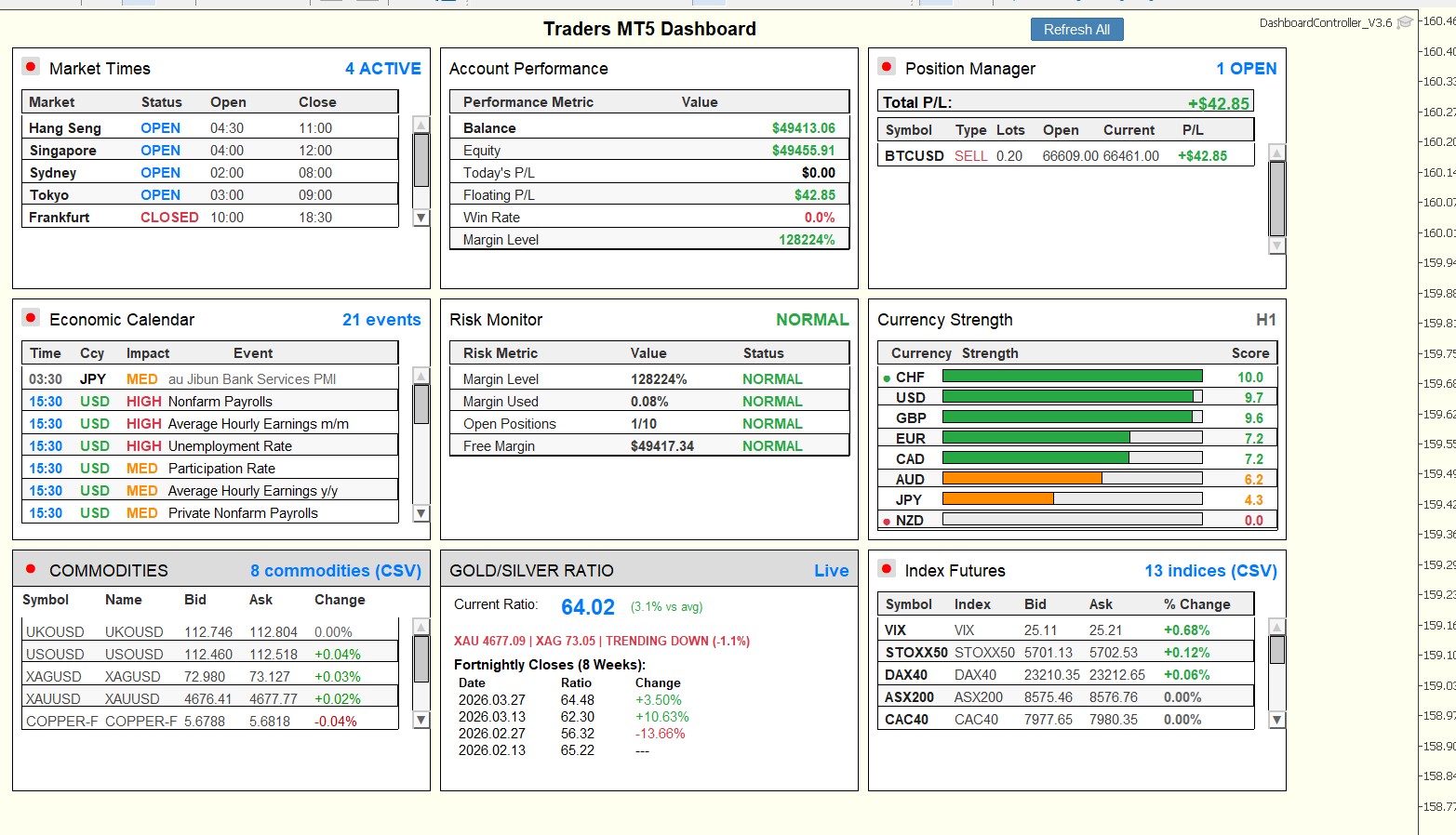 Your trading cockpit in a single view. The Trader Dashboard brings together account status, market conditions, open positions, and key decision metrics — giving you complete situational awareness without switching between multiple windows.